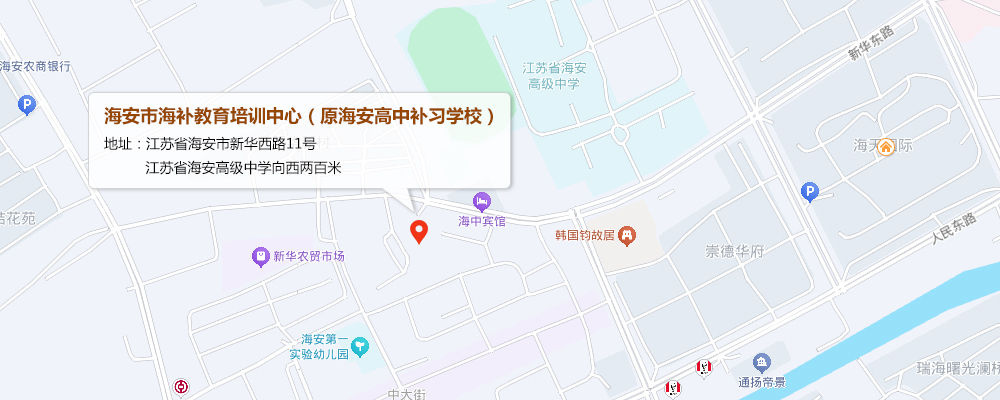 江苏省海安市新华西路11号(海安中学向西两百米)
